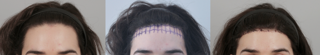 Hairline lowering surgery results are instant and healing time for the scar differs per individual. The incision is not cut in a straight line, rather in a wave like pattern to avoid creating very visible scars. It is hidden at the hairline, so it looks natural, and as the scars fade (usually within 6-12 months) with the proper post-surgery care, it is becomes almost undetectable.