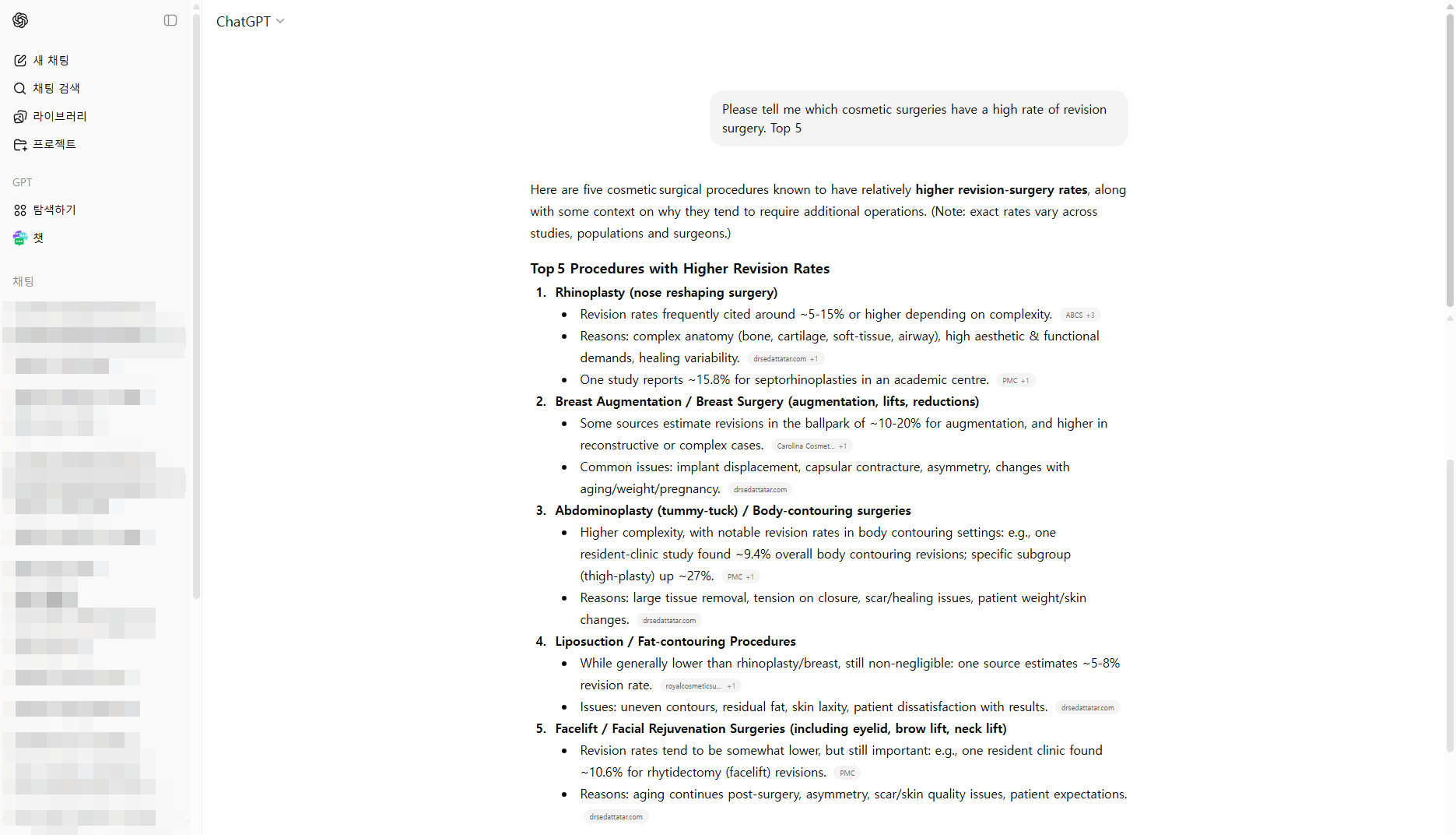 I asked ChatGPT, “Please tell me which cosmetic surgeries have a high rate of revision surgery.”