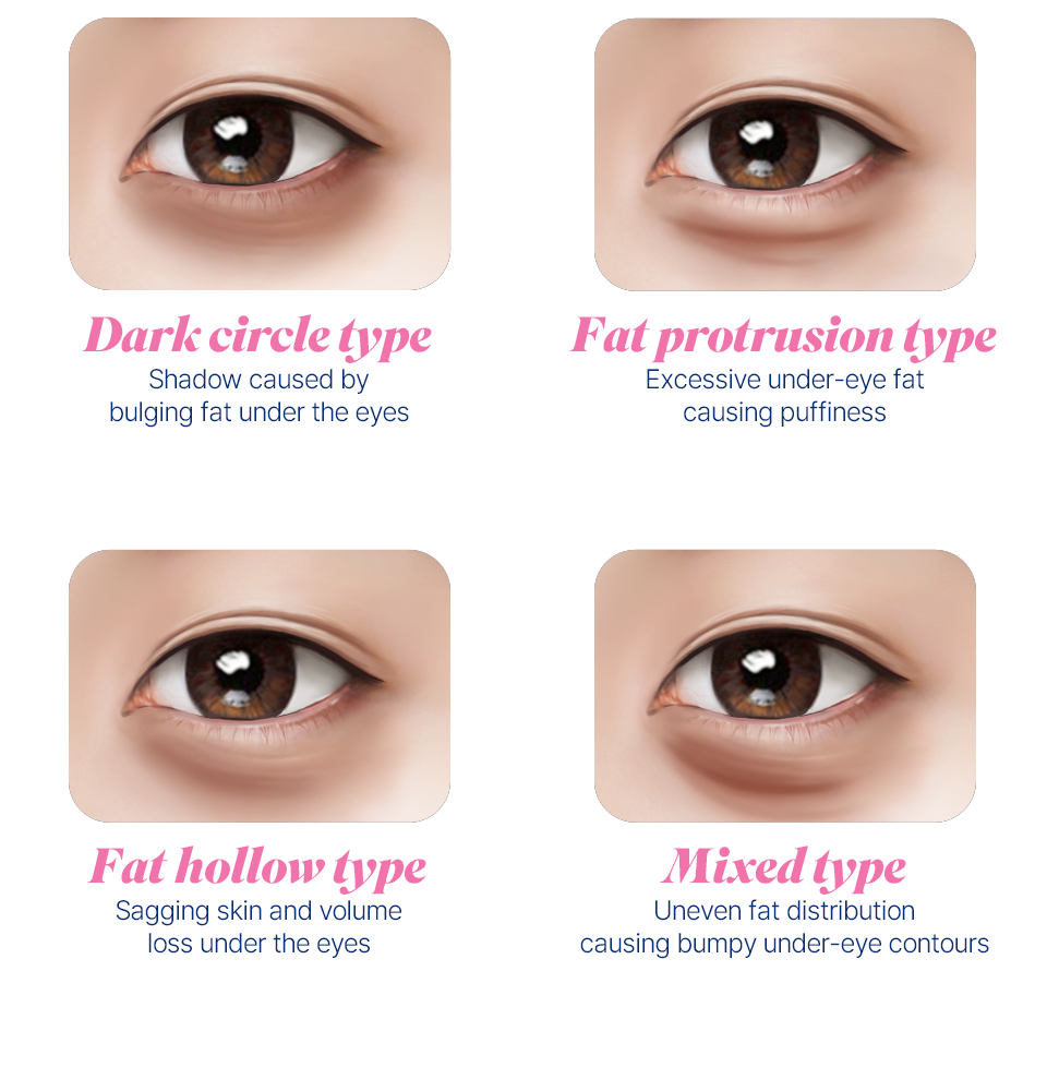 • Fat protrusion type: Excessive under-eye fat causing puffiness